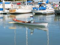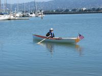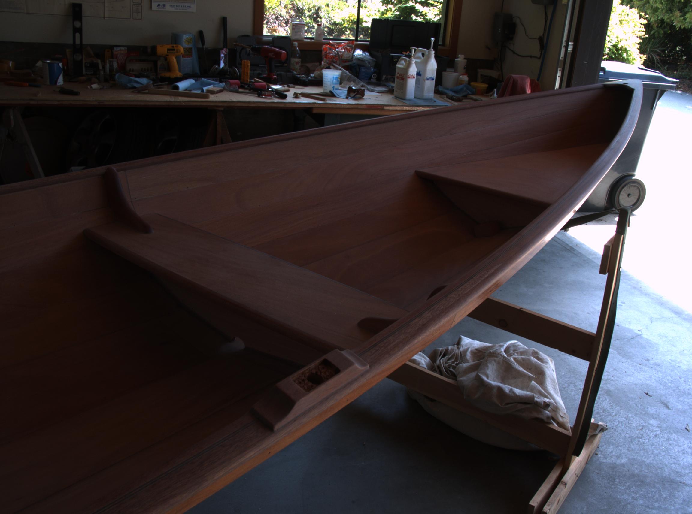 The last step was to Varnish and paint the boat. We decided to paint the hull traditional white, and we varnished the inside. The boat has an incredibly shallow draft and can take the weight of two people without any trouble at all. It is a little unstable but has no problem taking light chop (not shown). The boat is fast and straight and tends to want to keep going. With one person on the oars and waiting three seconds between pulls I was able to maintain around 4.5 to 5 knots. With two people on the oars we can maintain 5 knots, maybe slightly faster. It took surprisingly little effort to row around (it's faster then a canoe). We're calling this one a success.